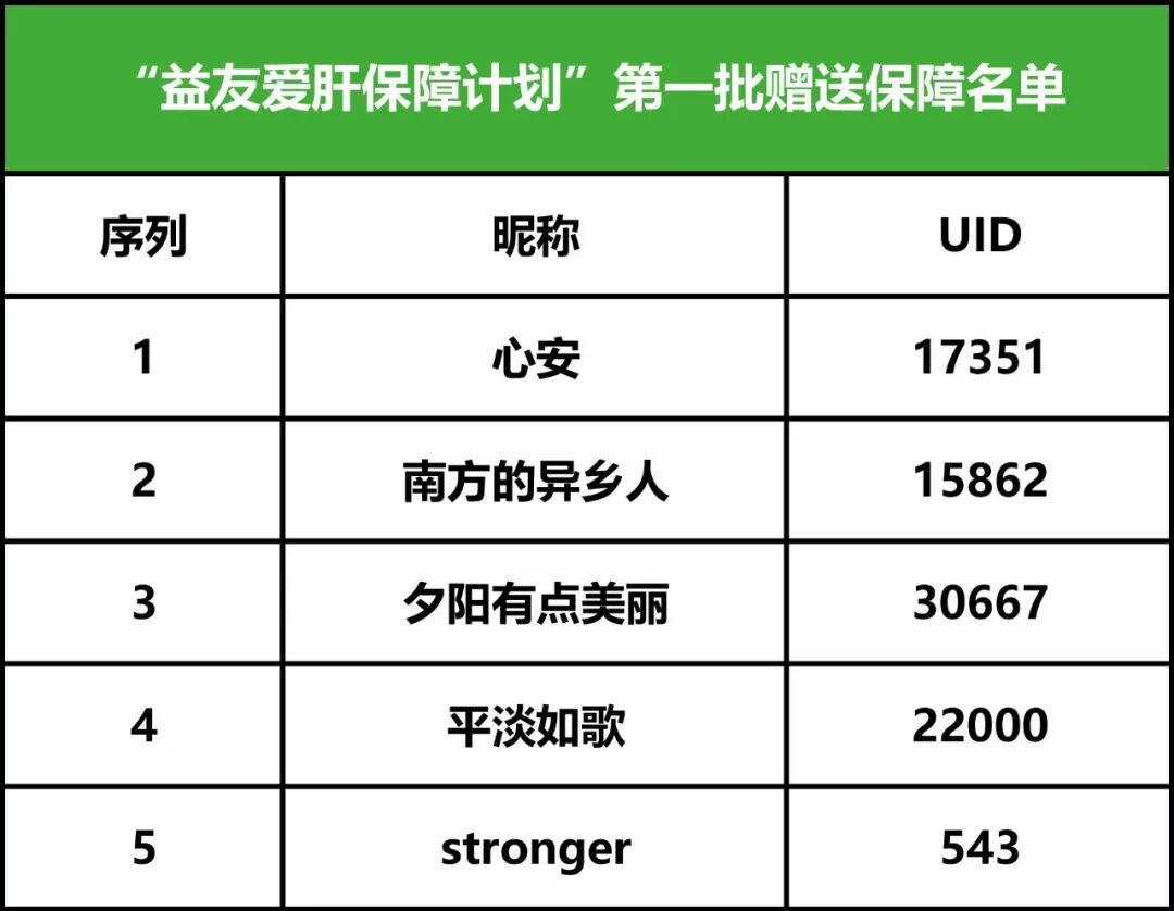 统计亿友APP上《乙肝战友如何购买保险?》文章截止7月27日中午12时的跟帖留言名单,并除去重复名单。在名单中随机抽取5名会员。 ▲“益友爱肝保障计划”第一批赠送保障名单